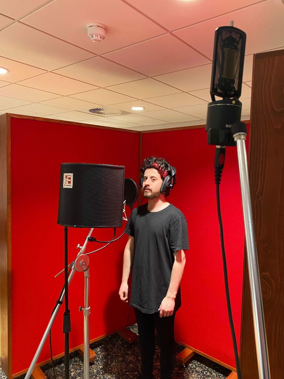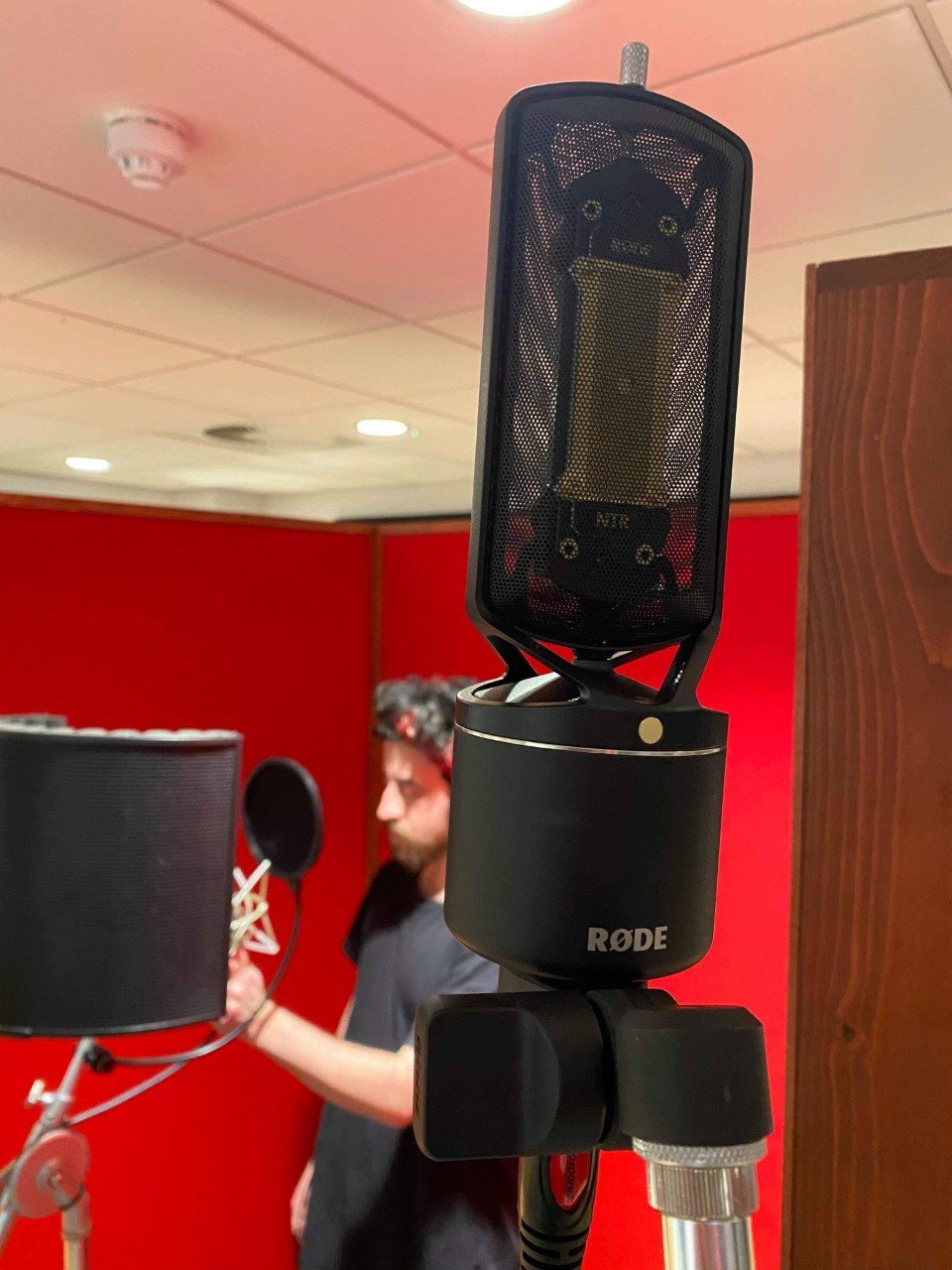 Above: Vocal mic set-up left, Neumann U87 Ai Middle, Rode NTR right.